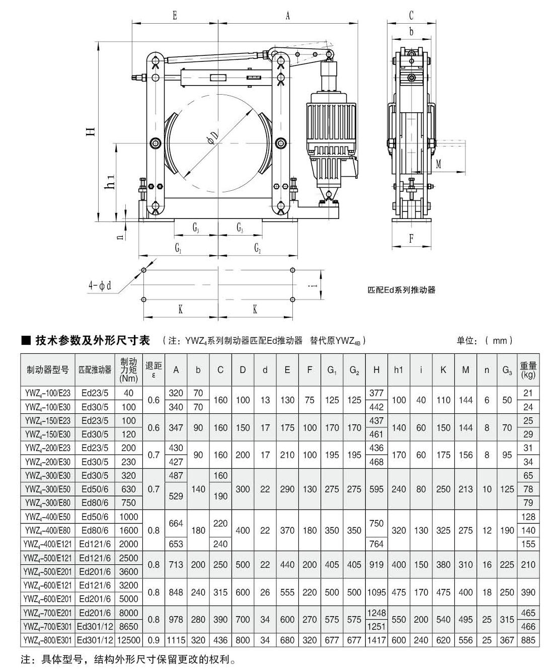 YWZ4(Ed)系列電力液壓鼓式制動器的連接尺寸和制動力矩參數(shù)符合JB/ZQ4388-86標準,技術要求符合JB / T6406-2006標準。